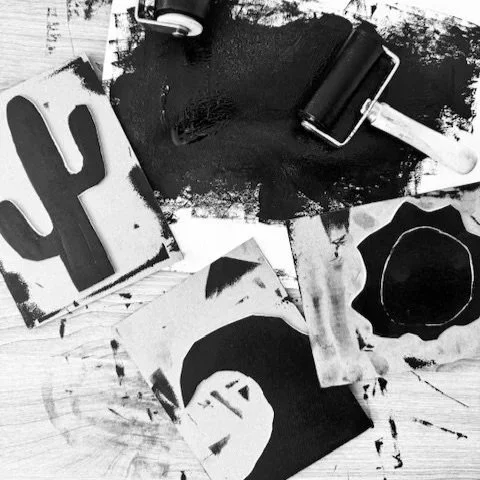 Receive a linoleum block to design and hand carve your own stamp using our studio carving tools. Or, use studio stamps to curate your design. Then, select ink colors and print your design on a choice of notecards or a canvas tote bag.